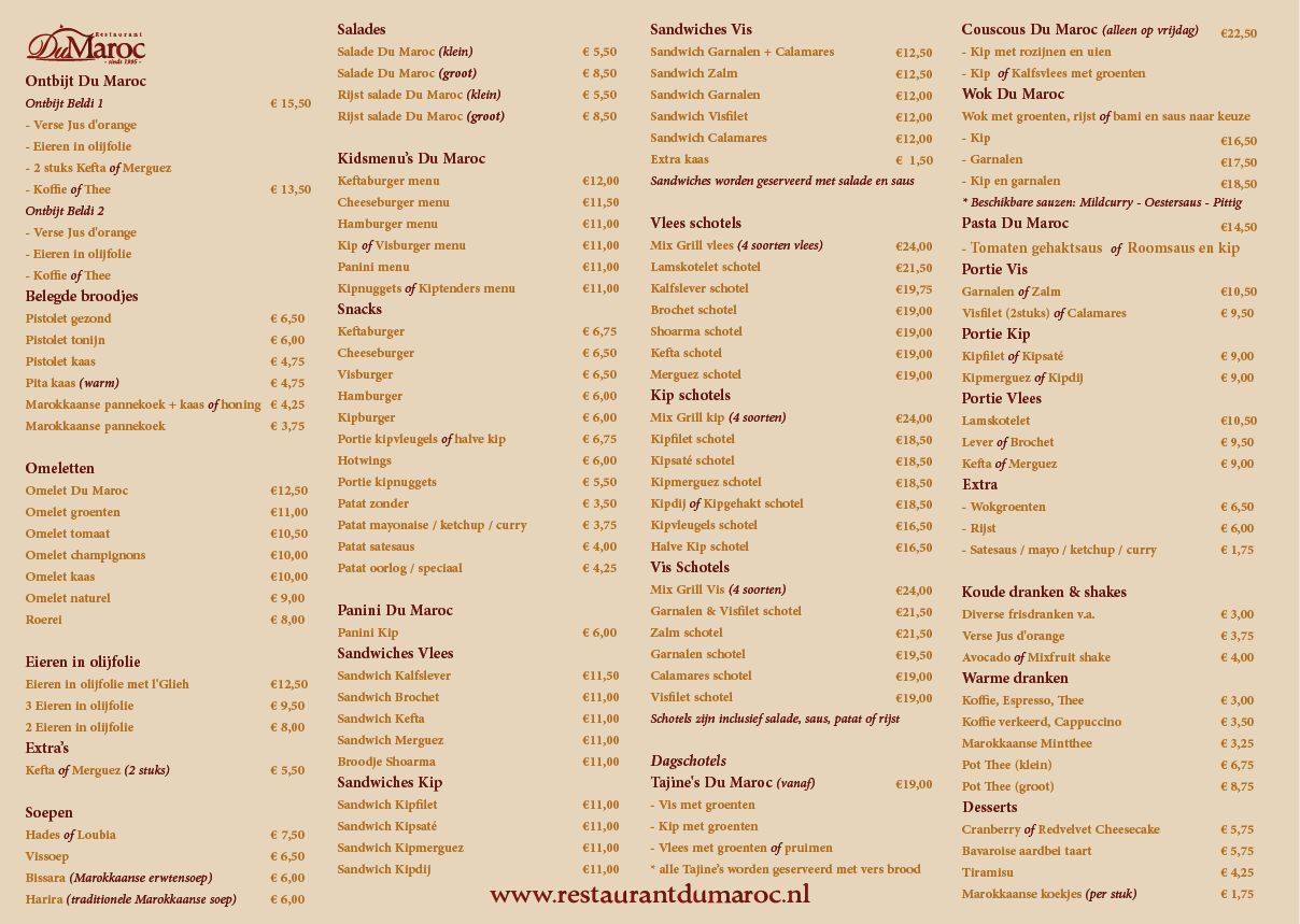 Restaurant Du Maroc heeft een gevarieerd menu met voor ieder wat wils. Van Malse vleesgerechten tot heerlijke visschotels en van panini’s tot wokschotels. Voor kinderen zijn er speciale kidsmenu’s samengesteld.